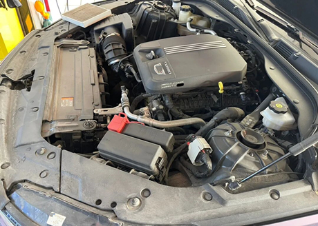 Al abrir el compartimento del motor, se puede apreciar el estado general del interior, relativamente limpio, con solo una capa de polvo flotante. El motor tiene una disposición longitudinal y tracción trasera. Modelo LSY, 2.0 litros turboalimentado.