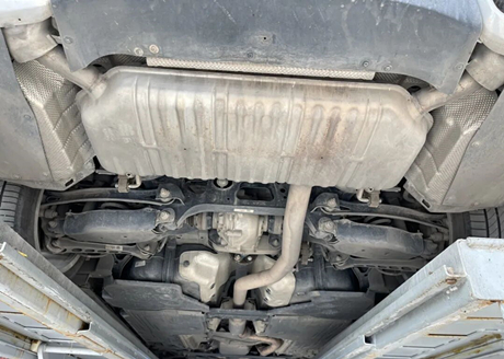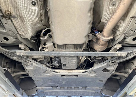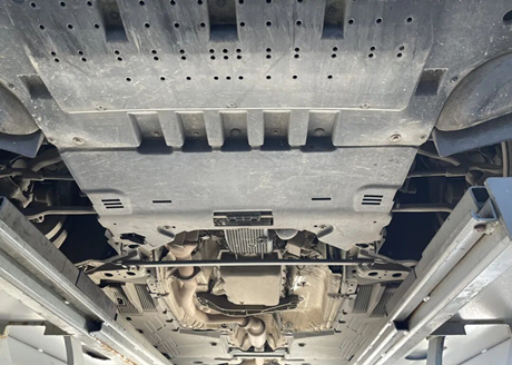 Levante el coche y compruebe el estado del chasis. Hay una placa protectora de plástico en la parte inferior del motor, pero solo protege la mitad delantera. Hay placas protectoras a ambos lados de la carrocería central.