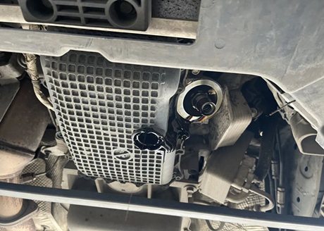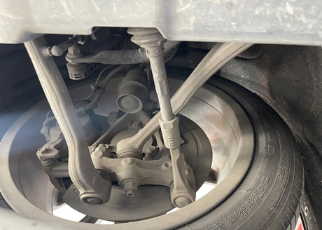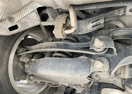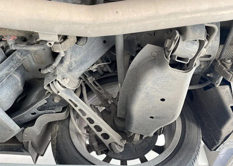 Revise los componentes de la suspensión delantera, principalmente el manguito de goma y la rótula; no hay problemas. El cárter de aceite del motor es de plástico. Aunque no tiene placa protectora en la parte inferior, cuenta con un travesaño reforzado para su protección. El cárter está oculto entre el subchasis y el travesaño para mayor protección y facilitar el drenaje del aceite. El filtro de aceite está ubicado junto a él para facilitar su reemplazo.