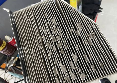 Al mismo tiempo que se vació el aceite de motor usado, el técnico reemplazó el filtro de aceite y luego bajó el auto. Al inspeccionar el filtro del aire acondicionado, se encontró que estaba particularmente sucio, como se muestra en la imagen de abajo. Este es el lado del filtro del aire acondicionado que filtra el aire, con mucho polvo e impurezas.