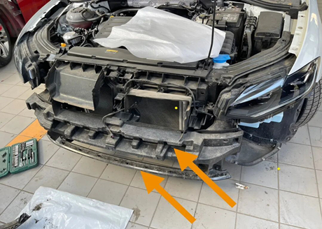 As shown in the picture below, the front bumper has been removed by the master. It can be seen that the front part of the internal collision beam is made of black cushioning plastic, and the lower part is made of anti roll bar iron.