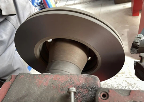 El disco de freno se ha fijado a la mandrinadora y girará con el eje fijo. La cuchilla adyacente raspará una capa de la superficie del disco.